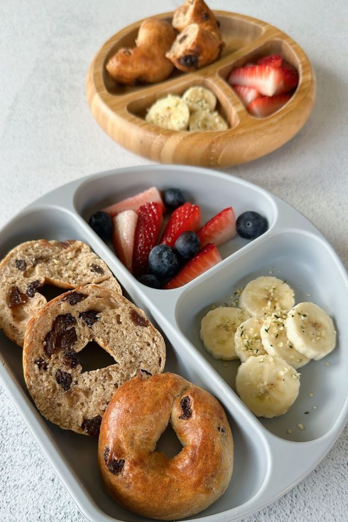 How to set it up: Offer a mini bagel (toasted, cut in half), a small bowl of cream cheese or mashed avocado, and tiny bowls of “sprinkles” like finely chopped strawberries or cucumber .